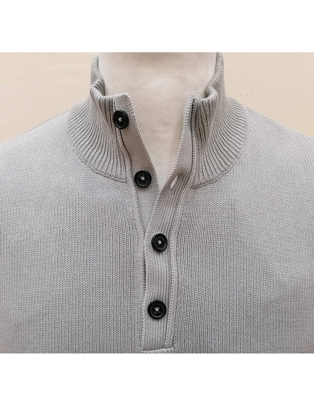 Maglione collo lupetto con quattro bottoni in filo di cotone 100%, effetto stone wash . Comodo e pratico maglione, ideale per il periodo autunnale, realizzato in un morbido filo di cotone lavato, ideale per un outfit casual ma sobrio